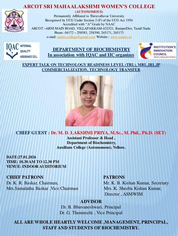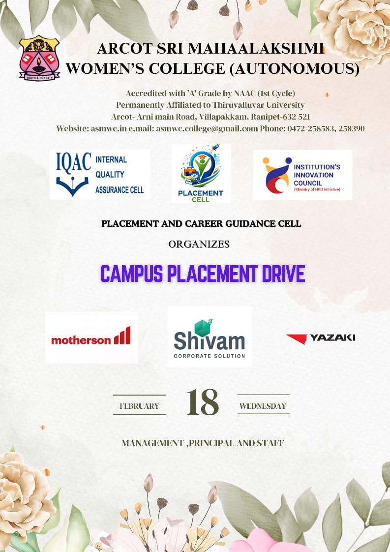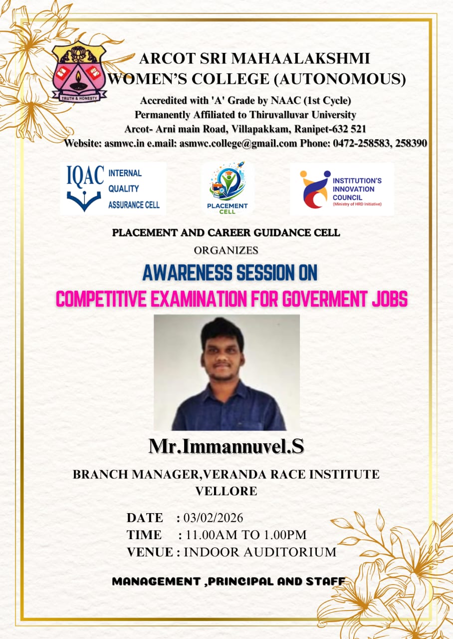 ASMWC" class="d-block" style="width: 100%; height: auto;" />With Innumerable and spontaneous showers of the blessings of the Almighty, Arcot Sri Mahaalakshmi Women’s College was started in the year 1999 to fulfill the long demand of people in and around Arcot for the upliftment of underprivileged girls and to propagate women’s education...